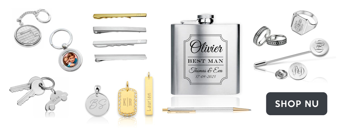 Maak uw outfit compleet met stijlvolle herenaccessoires, ontdek de mooiste items. Reversspelden en dasschuiven voorzien van een persoonlijke gravure. Maar ook Sterling Zilveren pennen en Credit Cardhouders en heupflessen met een persoonlijke gravure, feestelijk verpakt en zeer geschikt als cadeau.