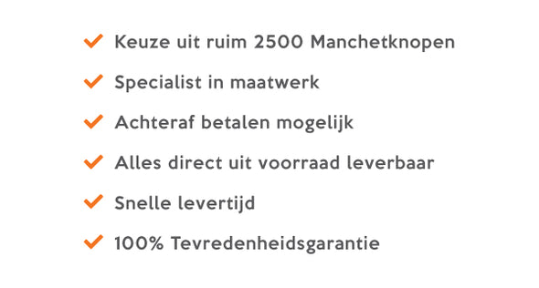 Zilveren Manchetknopen en gouden manchetknopen koopt u bij Manchetknopen.com. Wij hebben de grootste collectie manchetknopen van Nederland. In deze uitgebreide collectie vindt u o.a. manchetknopen, van Zilver & Goud maar ook Munt Manchetknopen. U vindt bij ons voor iedere gelegenheid manchetknopen, direct gemakkelijk en veilig online kopen en betalen.