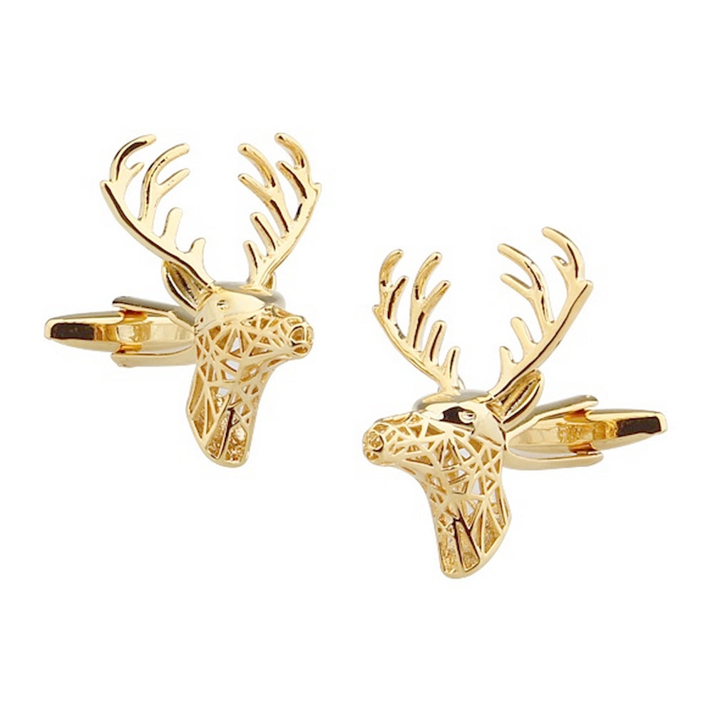 Uitgewerkte set manchetknopen van een hertenkop met gewei in een prachtige goudkleurige toplaag. De kop van het hert is uitgebeeld in lijnen - lineart - mooie manier om de kop van het hert levensecht, maar toch modern weer te geven.