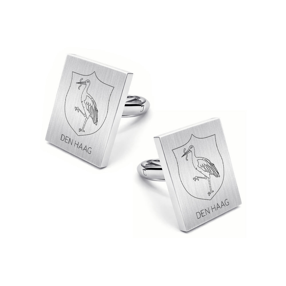 Een subtiele ode aan Den Haag: het stadswapen verfijnd gegraveerd in een stijlvolle set manchetknopen. Perfect voor formele gelegenheden, als representatief geschenk of als persoonlijk aandenken aan de Residentie.