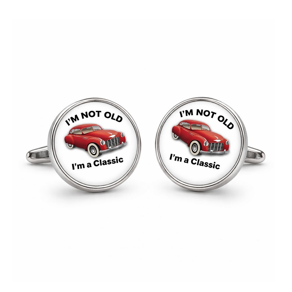 Voeg een vleugje elegantie toe aan je outfit met onze ronde manchetknopen die de afbeelding van een klassieke auto sieren, vergezeld van de pakkende tekst: "I'm not old - I'm Classic". Deze manchetknopen zijn niet alleen een blikvanger, maar ook een perfecte geschenkoptie.