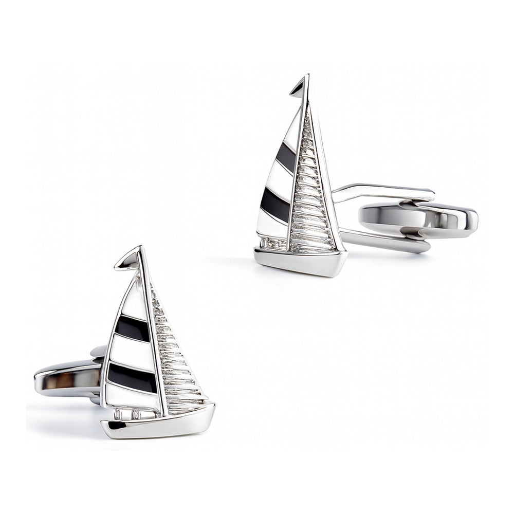 Vaar in stijl met deze elegante manchetknopen in de vorm van een zeilboot. Het ontwerp is verfijnd uitgevoerd met zilverkleurige details en een zilverkleurig mechaniek aan de achterzijde, waardoor deze zowel tijdloos als modern zijn.