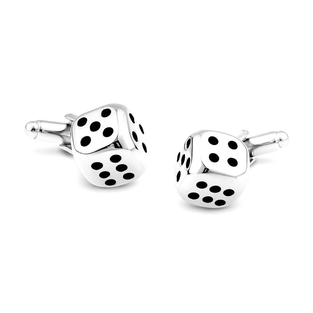 Glanzend zilverkleurige set Dobbelsteen manchetknopen, de ogen van de dobbelstenen zijn zwart ingekleurd. Het mechaniek is op de rand van de steen geplaatst, zo zijn alle ogen vanaf 1 tot 6 zichtbaar. Is een vrij zware set manchetknopen ruim 13 gram per manchetknoop.