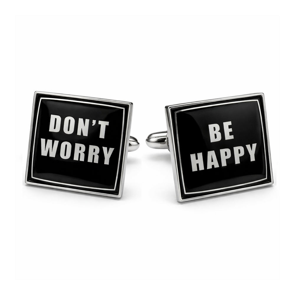 Voeg een vleugje vrolijkheid toe aan uw outfit met de unieke manchetknopen "Don't Worry, Be Happy". Deze manchetknopen hebben een zwarte basis en zijn voorzien van de inspirerende tekst in witte letters. Perfect als cadeau, zijn ze direct leverbaar en kunnen ook in grotere aantallen besteld worden.
