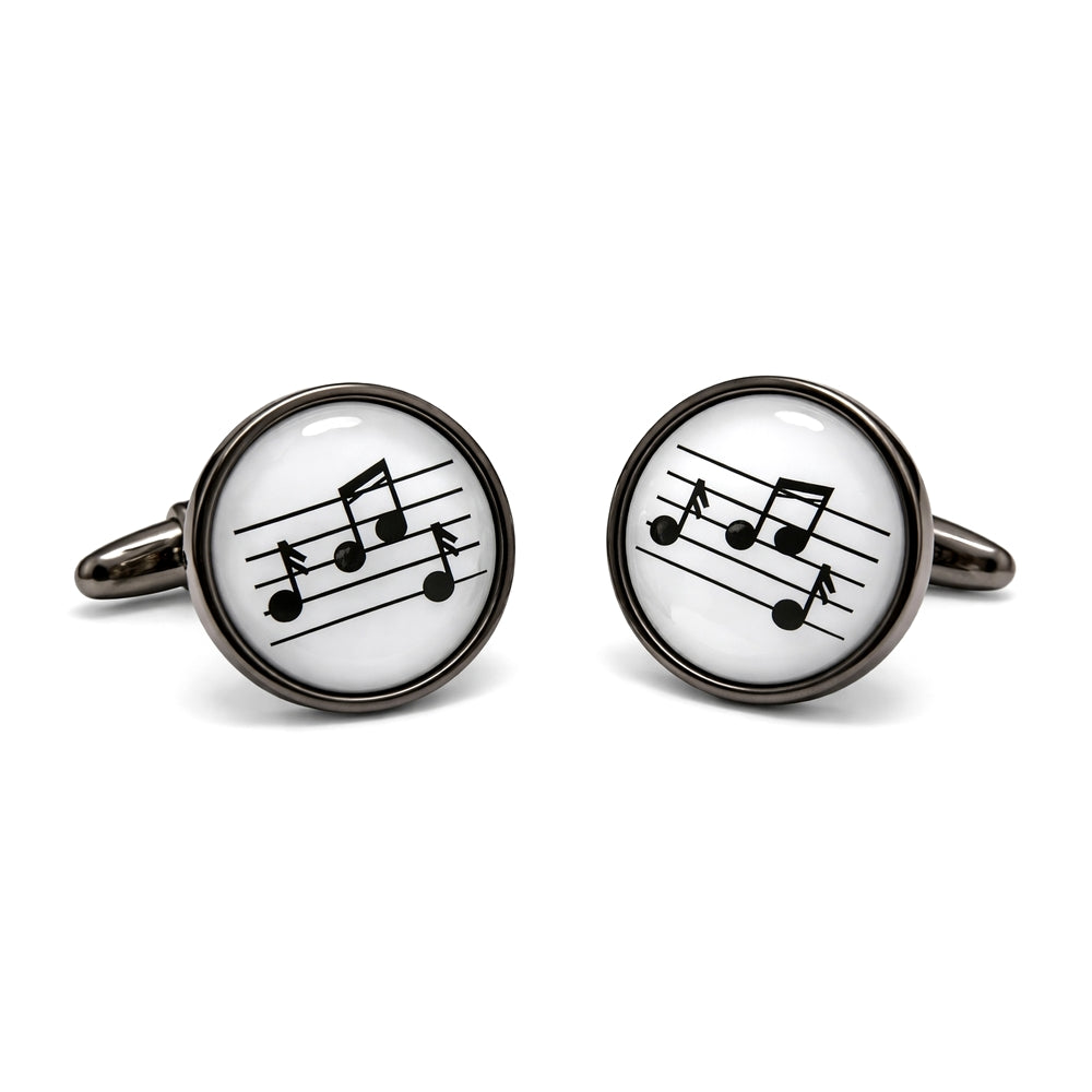 Het mechaniek van deze manchetknopen is antracietkleurig, op een witte achtergrond staan de zwarte noten en de notenbalk afgebeeld.
