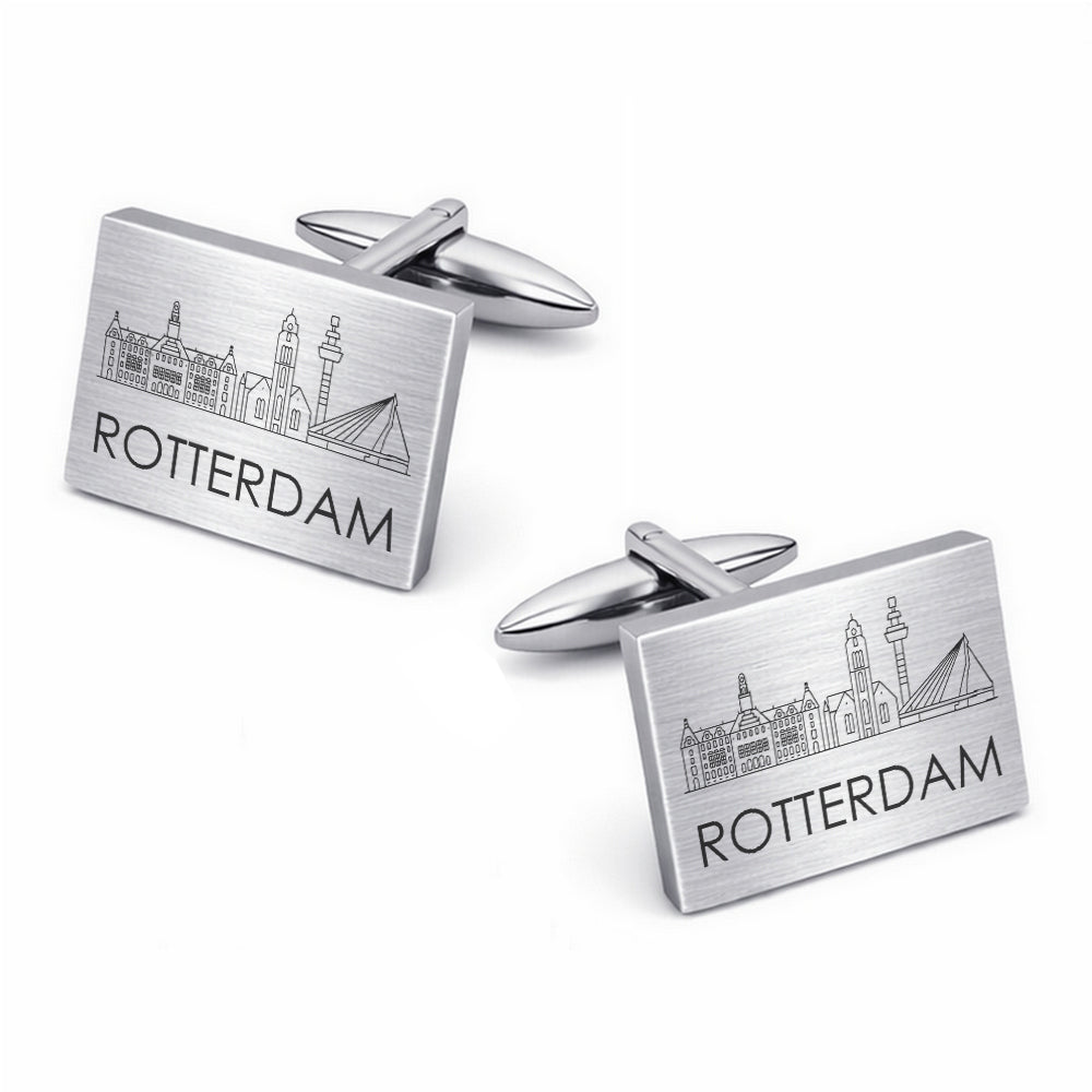 De skyline van Rotterdam, gegraveerd in een stijlvolle set manchetknopen. Subtiel genoeg voor een pak, maar met een duidelijke persoonlijke betekenis — ideaal als cadeau of als eigen statement.