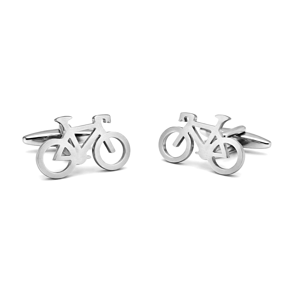 Stoere set Manchetknopen, voorzijde van de fiets is gematteerd, de achterzijde en het mechaniek zijn glanzend zilverkleurig.
