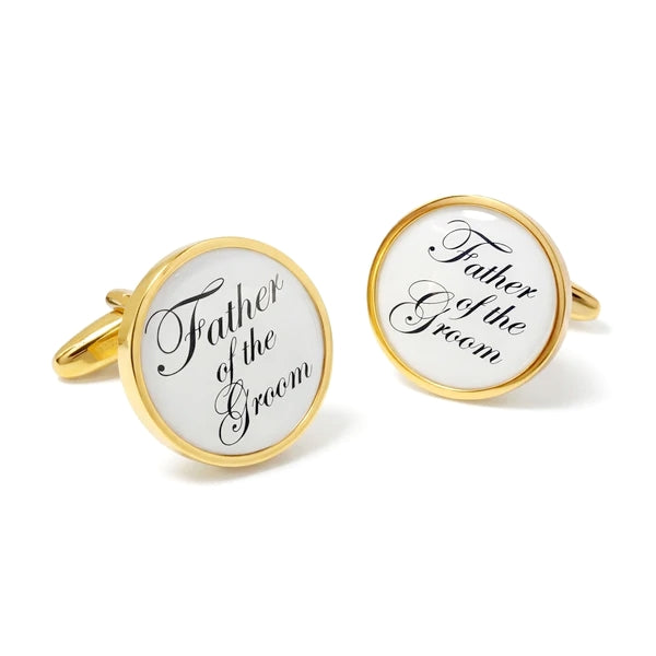 In een stijlvol lettertype staat de tekst 'Father of the Groom' deze ronde goudkleurige set Manchetknopen zal met trots gedragen gaan worden door de Vader van de Bruidegom.