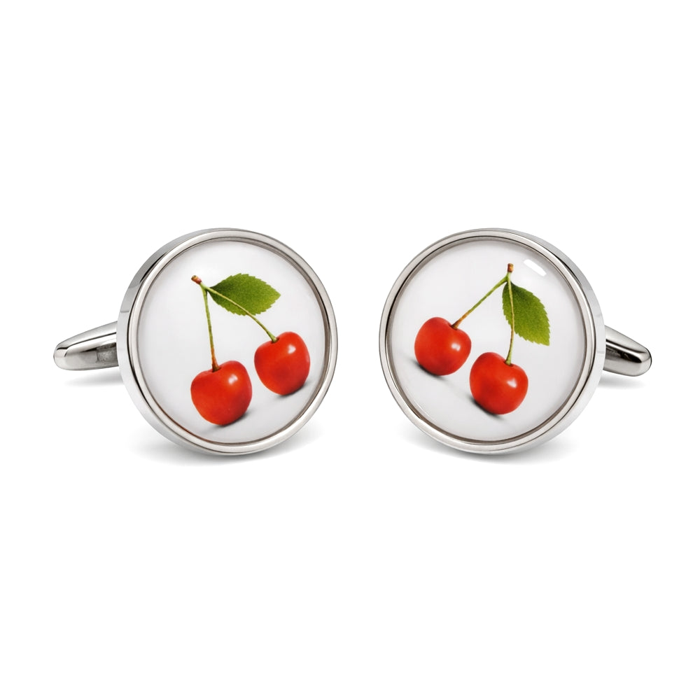 Bijna levensechte afbeelding van twee kersen, takje en een groen blaadje. Originele set Manchetknopen, grotere aantallen zijn ook snel leverbaar. Aan de achterzijde is een gravure mogelijk, denk hierbij aan een datum of een naam, aantal leestekens 20, verdeeld over de beide manchetknopen.