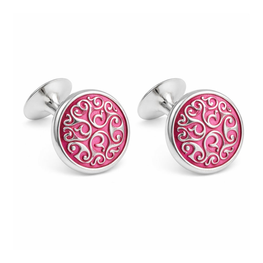 Prachtige zilverkleurige manchetknopen met hierop een Keltisch motief, de basis kleur is roze. Manchetknopen voor de verzamelaars.