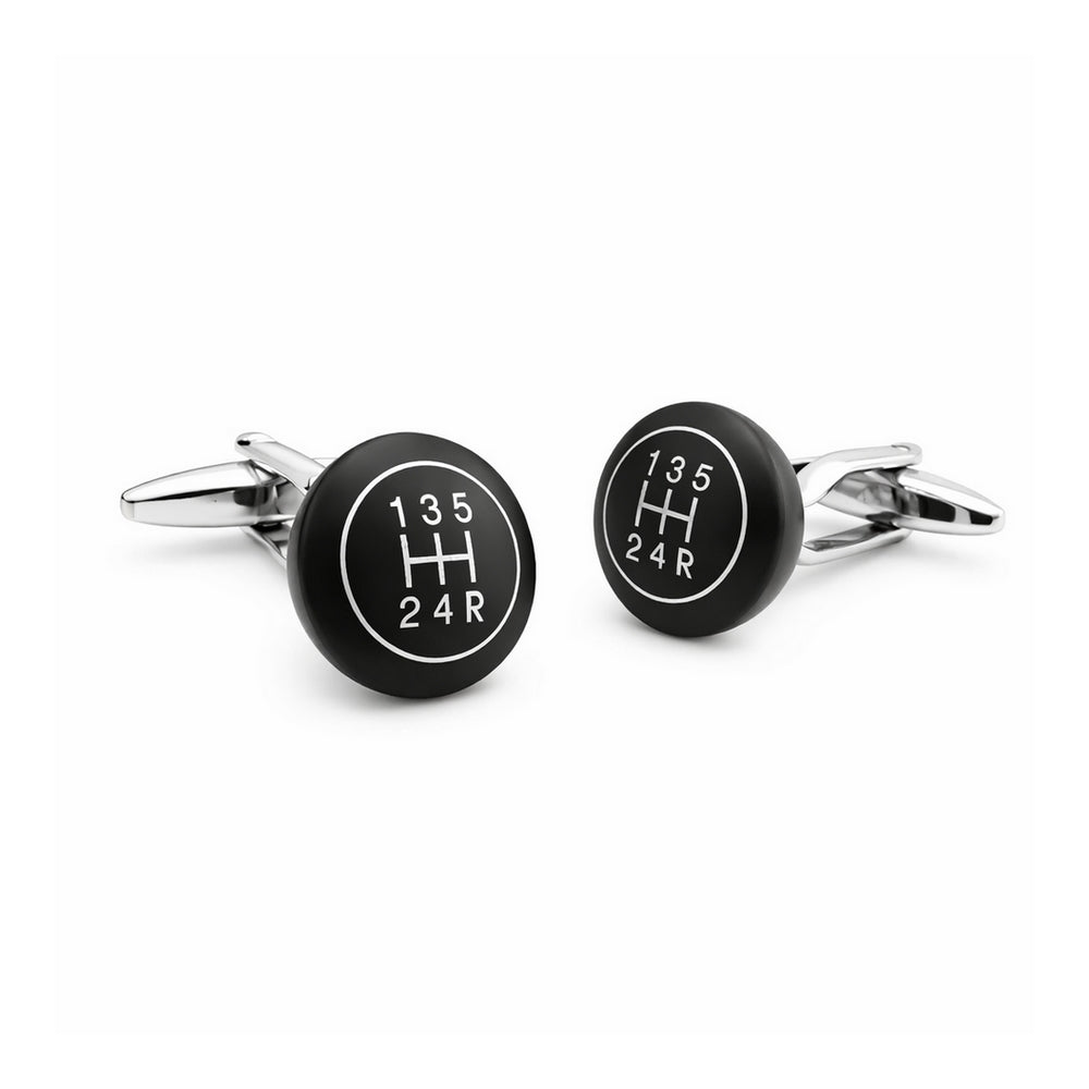 Ronde manchetknopen, voorzijde loopt iets bol. Op de zwarte basis staat de afbeelding van een schakelbak afgebeeld in witte cijfers en witte details. Set voelt mooi zwaar aan en is er erg mooi en straks qua ontwerp.