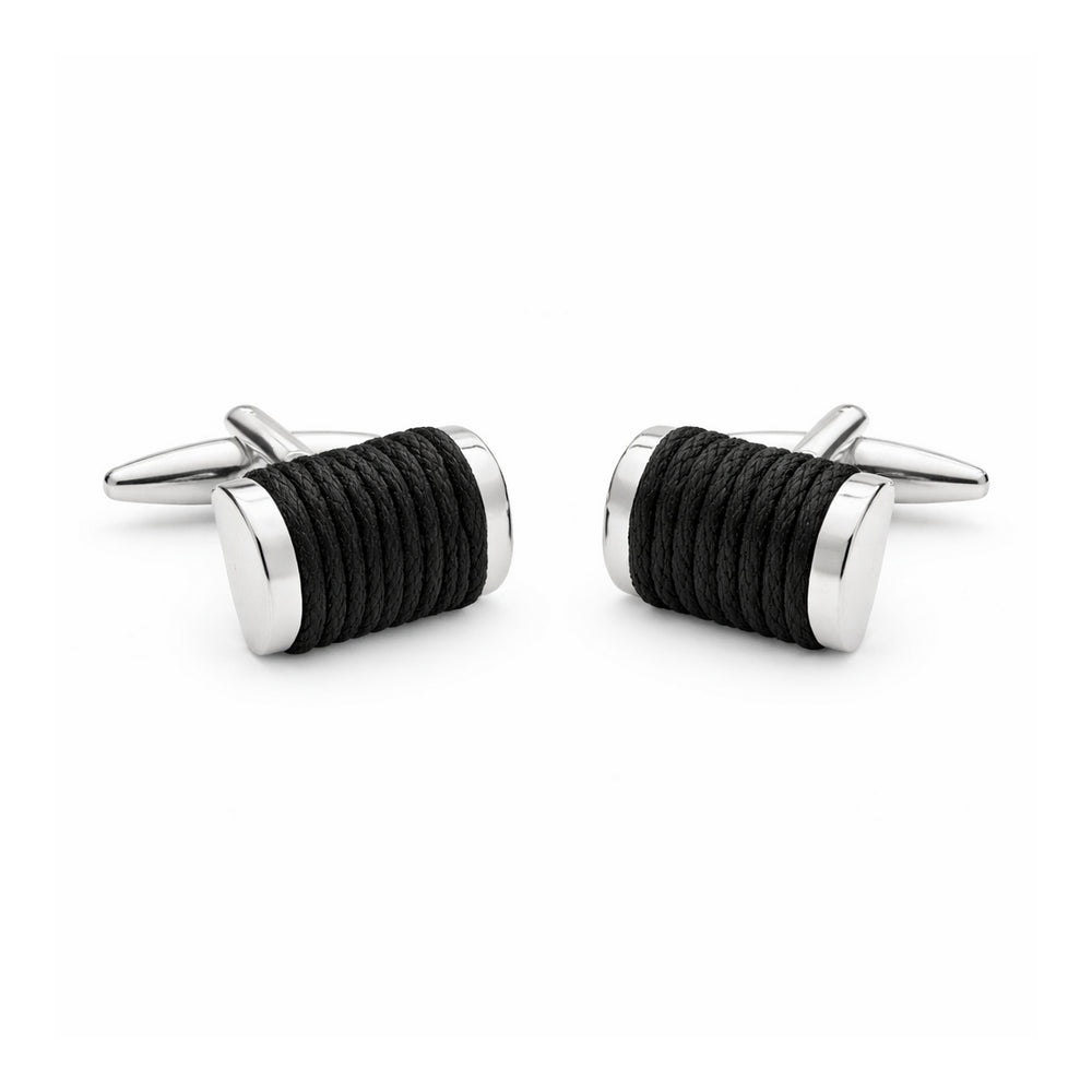 Zilverkleurig manchetknoop omwikkeld met zwart koord.