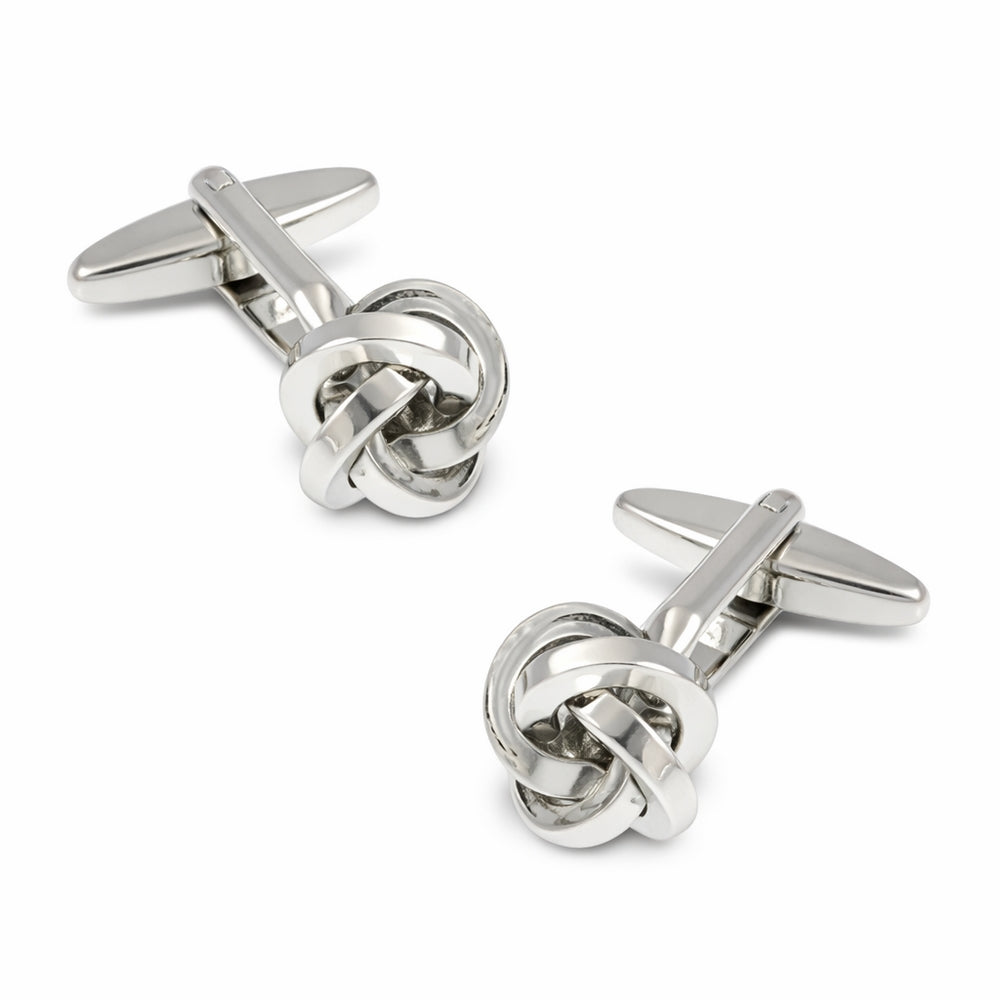 Deze zilverkleurige manchetknopen bestaan uit een aantal platte, smalle banen die in elkaar draaien. Een mooi vormgegeven en zeer smaakvolle manchetknoop!