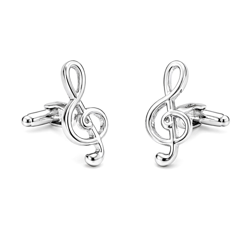 Deze zilverkleurige manchetknopen hebben de vorm van een G-sleutel. Gestileerde vorm een geschikt cadeau-idee voor een muzikale man.