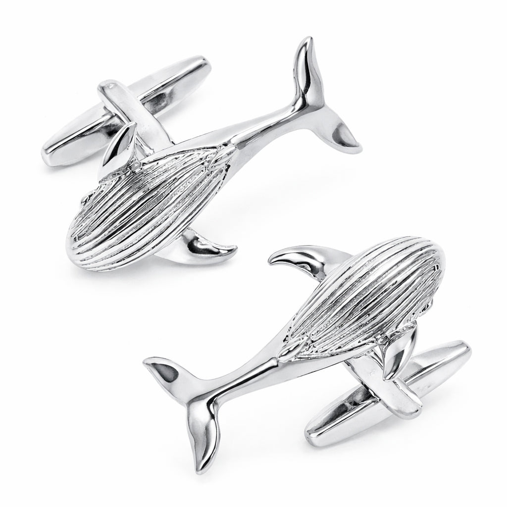 Zilverkleurige set manchetknopen in de vorm van een walvis. Alle details zijn goed zichtbaar en voelbaar. Prachtig cadeau voor de man die houdt van de zee of misschien wel eens in het echt walvissen heeft gezien (of wil gaan zien). Voor de man die houdt van reizen is dit ook zeker een passende set manchetknopen.
